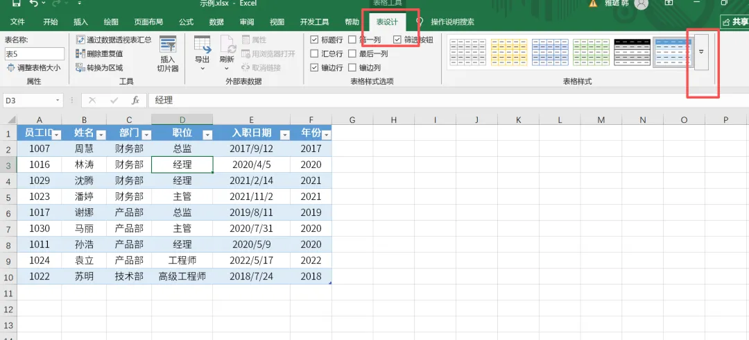 如果样式不喜欢,可以单击表格内任意一个有内容的单元格。表设计,单击红框小三角,有很多表格样式可以选择。这样做惊喜在哪里?