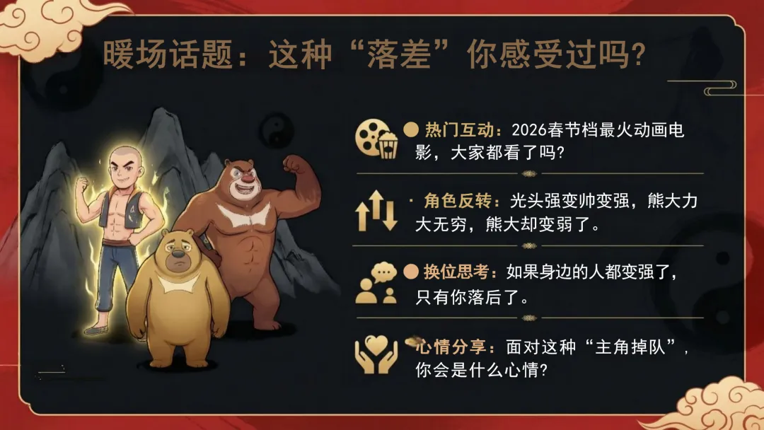 老师:咱们先来个热门话题大讨论。今年春节档最火的那个动画电影《熊出没·年年有熊》,大家都看了吗?