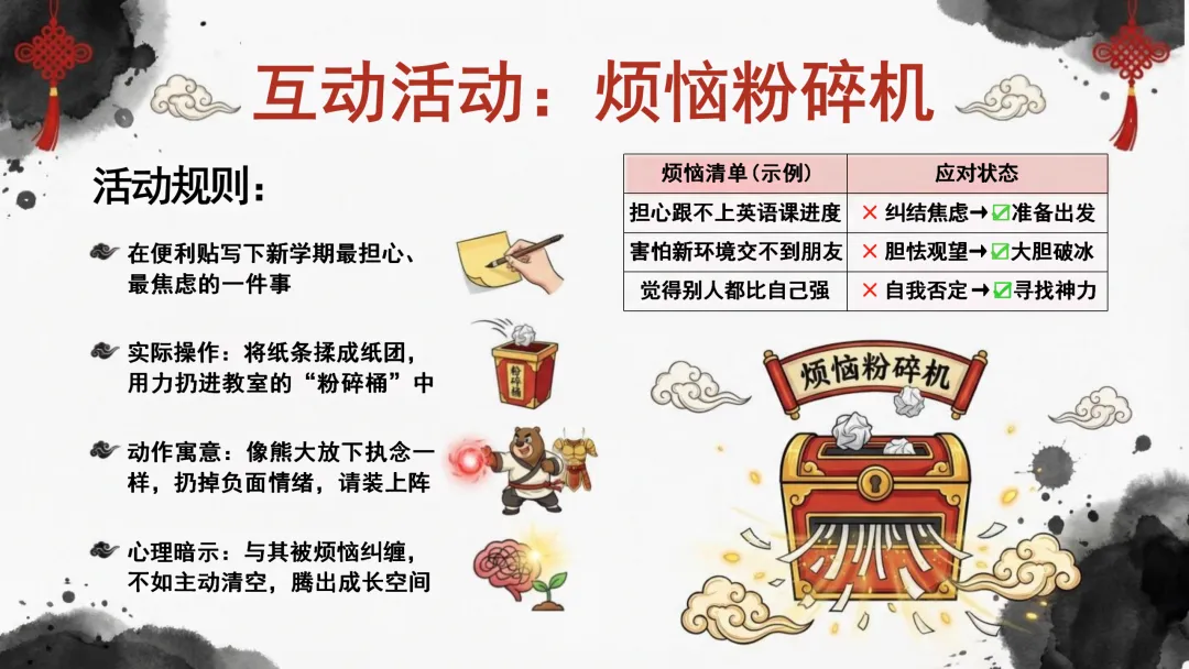 ·物料:每人发一张便利贴、一支笔,讲台前放一个贴着“烦恼粉碎机”的垃圾桶。