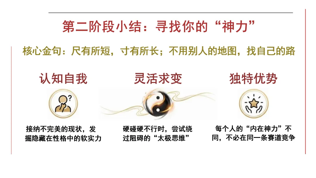 老师:所以,第二阶段老师想告诉大家:尺有所短,寸有所长;不用别人的地图,找自己的路。