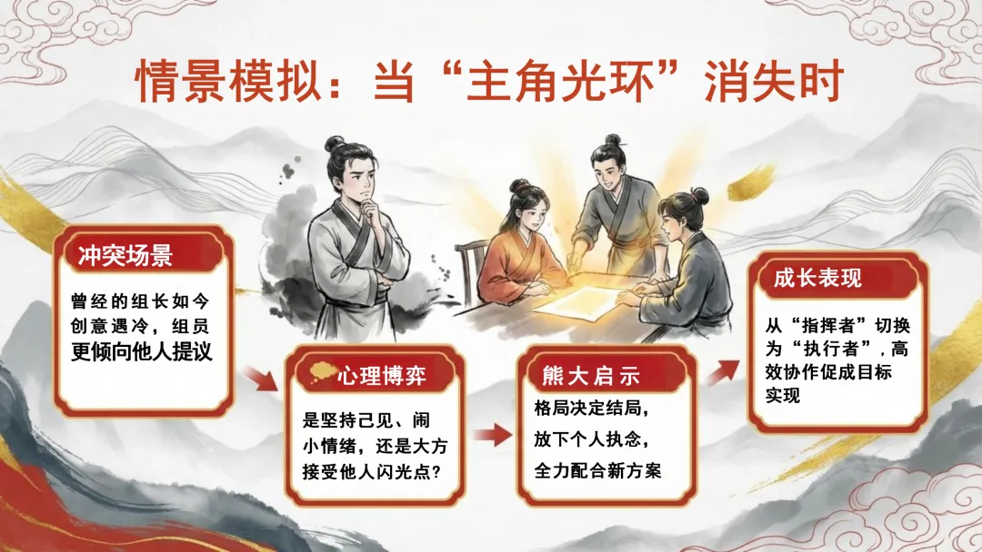 老师:咱们来做个假设。假如以前你是小组长,大家都听你的。但这学期,有人提出了一个比你更好的建议,大家都支持他。这时候“主角光环”没了,你会怎么做?