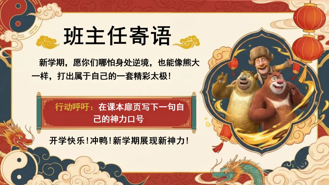 很高兴在这与您相遇,如果您是一位班主任老师,每天除了应对繁重的教学工作,还要加班整理班级、教务、教研、课件PPT资料,请关注下方的“小木教务资料”,让我们风雨同路、一起成长~今天分享的是2026春季开学第一课主题班会的ppt课件和配套的发言稿,主题是《像熊大一样“逆风翻盘”:新学期,寻找你的内在神力》。2026年春季开学第一课主题班会