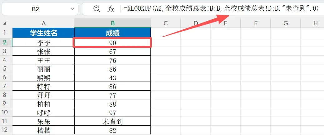 excel=XLOOKUP(A2, 全校成绩总表!B:B, 全校成绩总表!D:D, "无成绩", 0)