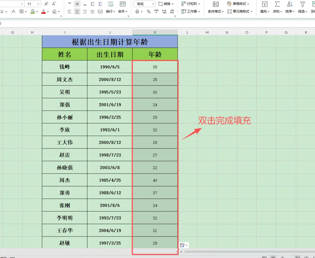 第五步:选中单元格,鼠标移动到右下角,双击填充。