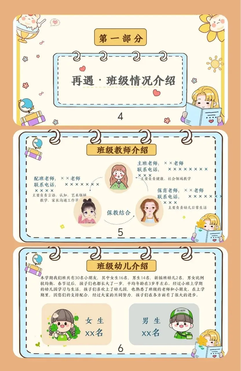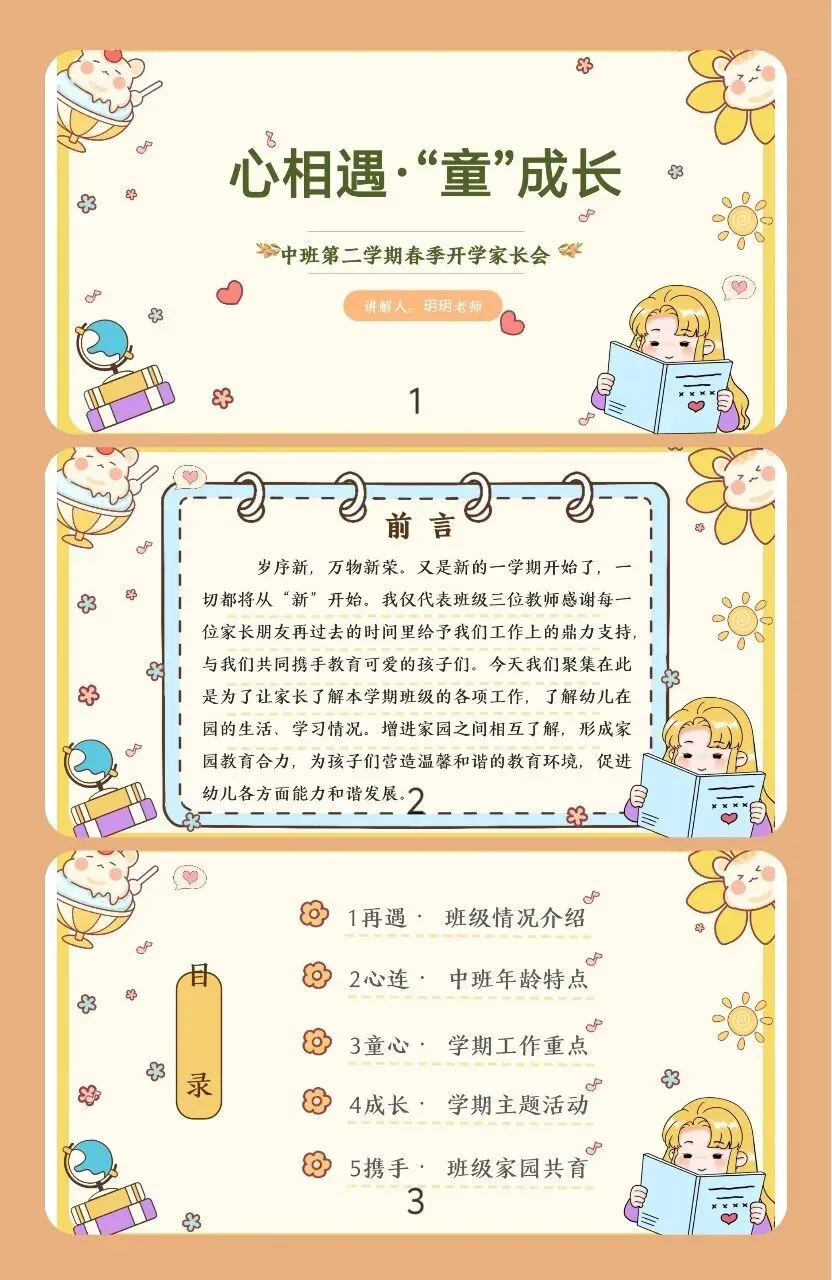 岁序新,万物新荣。又是新的一学期开始了,一切都将从“新”开始。我仅代表班级三位教师感谢每一位家长朋友再过去的时间里给予我们工作上的鼎力支持,与我们共同携手教育可爱的孩子们。今天我们聚集在此是为了让家长了解本学期班级的各项工作,了解幼儿在园的生活、学习情况。增进家园之间相互了解,形成家园教育合力,为孩子们营造温馨和谐的教育环境,促进幼儿各方面能力和谐发展。