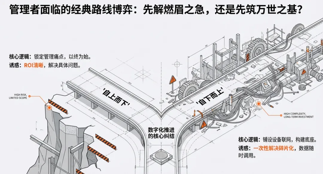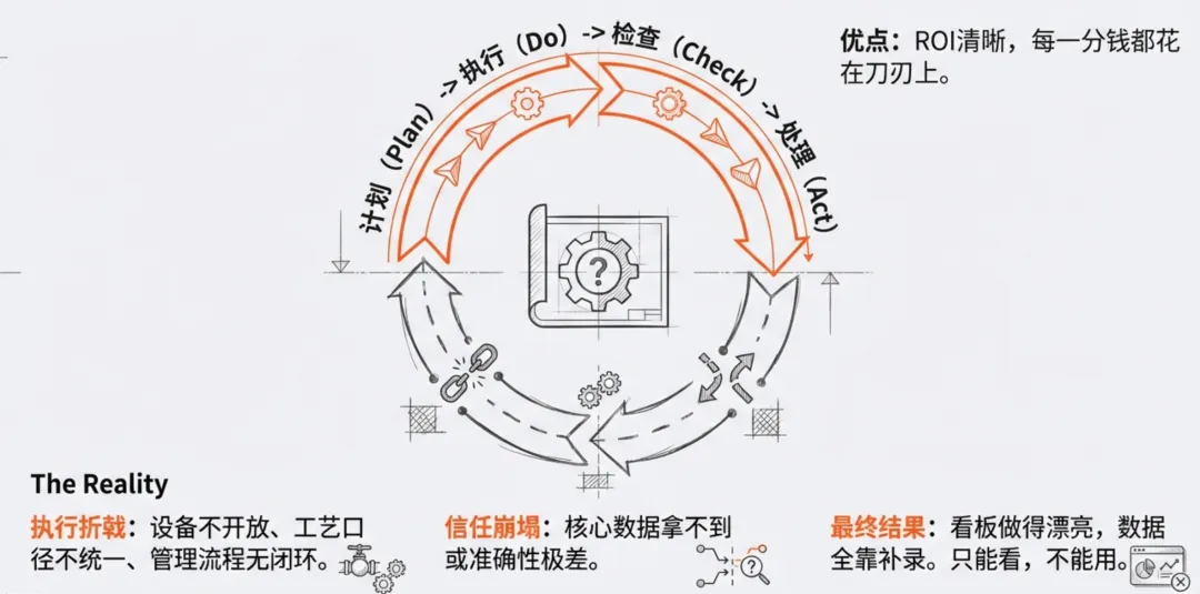 在智能制造的推进过程中,很多管理者都会面临一个经典的“路线纠结”:是先锁定要解决的管理问题(自上而下),还是先铺好设备联网和数据底座(自下而上)?如果选择先看结果,往往会发现现场设备五花八门,数据接不齐、对不上,最后看板做得很漂亮,但数据全靠补录,变成了只能看、不能用的“PPT工厂”。如果选择先打底座,投入大量资源把所有设备都连上网,却发现数据采了一堆,却没人知道怎么用,最终在服务器里静静“吃灰”,变成了耗资巨大的“数据坟场”。自上而下的“管理闭环”:为何总在执行现场折戟?