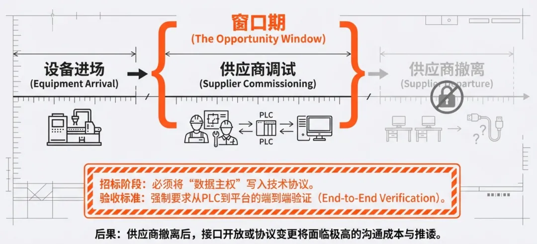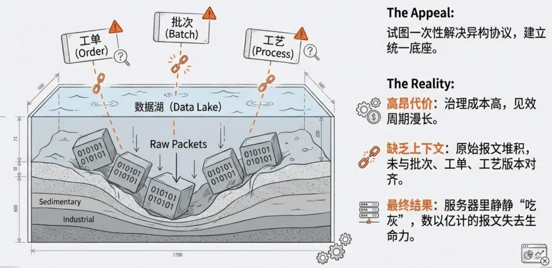 另一种极端是“先铺路、后开车”。即不管现在用不用,先把设备信号标准化,建立一套完整的数据字典和对象模型。这种策略在工厂建设初期非常吸引人,因为它能一次性解决异构协议和数据碎片化的问题。只要底座够稳,未来无论业务怎么变,数据都能随时被调用。但它的代价是高昂的治理成本和漫长的见效周期。管理者往往要面对持续的投入,却看不到直接的业务产出。如果缺乏业务牵引,团队很容易陷入“为了采集而采集”的自我感动中。当数以亿计的原始报文堆积在数据库里,却没有与具体的批次、工单、工艺版本对齐时,这些数据就失去了生命力。等到真正要用时,才发现缺了最关键的上下文。执行层面的“致命盲区”:别在供应商撤离后才想起追数据