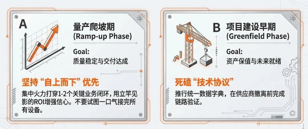 在解决了“能不能采到”的物理前提后,接下来要解决的是“采什么”的效率问题。在真实的工厂环境下,单纯依靠某种路线都是危险的。最稳妥的量产打法是“顶层目标牵引 + 底层标准化沉淀”,即在不同层级采用不同的策略。顶层应当通过少数“北极星闭环”来锁定采集优先级。例如,只选定瓶颈设备的OEE、关键工艺的SPC漂移等3-5个核心场景,确保这些闭环所需的数据必须实时、准确。这能让数字化团队摆脱“漫无目的”的忙碌,将资源投射到最能产生经济效益的环节。中层与底层则需要通过标准化来降低长期的维护成本。无论上层应用如何变,设备状态、工单节拍、物料批次、工艺版本、人员资质这五大核心对象,必须在接入时就完成对象模型定义。同时,遵循“80/20原则”,先覆盖核心闭环涉及的关键瓶颈设备,保证系统能快速产生价值,再根据业务演进逐步扩展到全线。管理者的决策清单:不同阶段的工厂该怎么选?