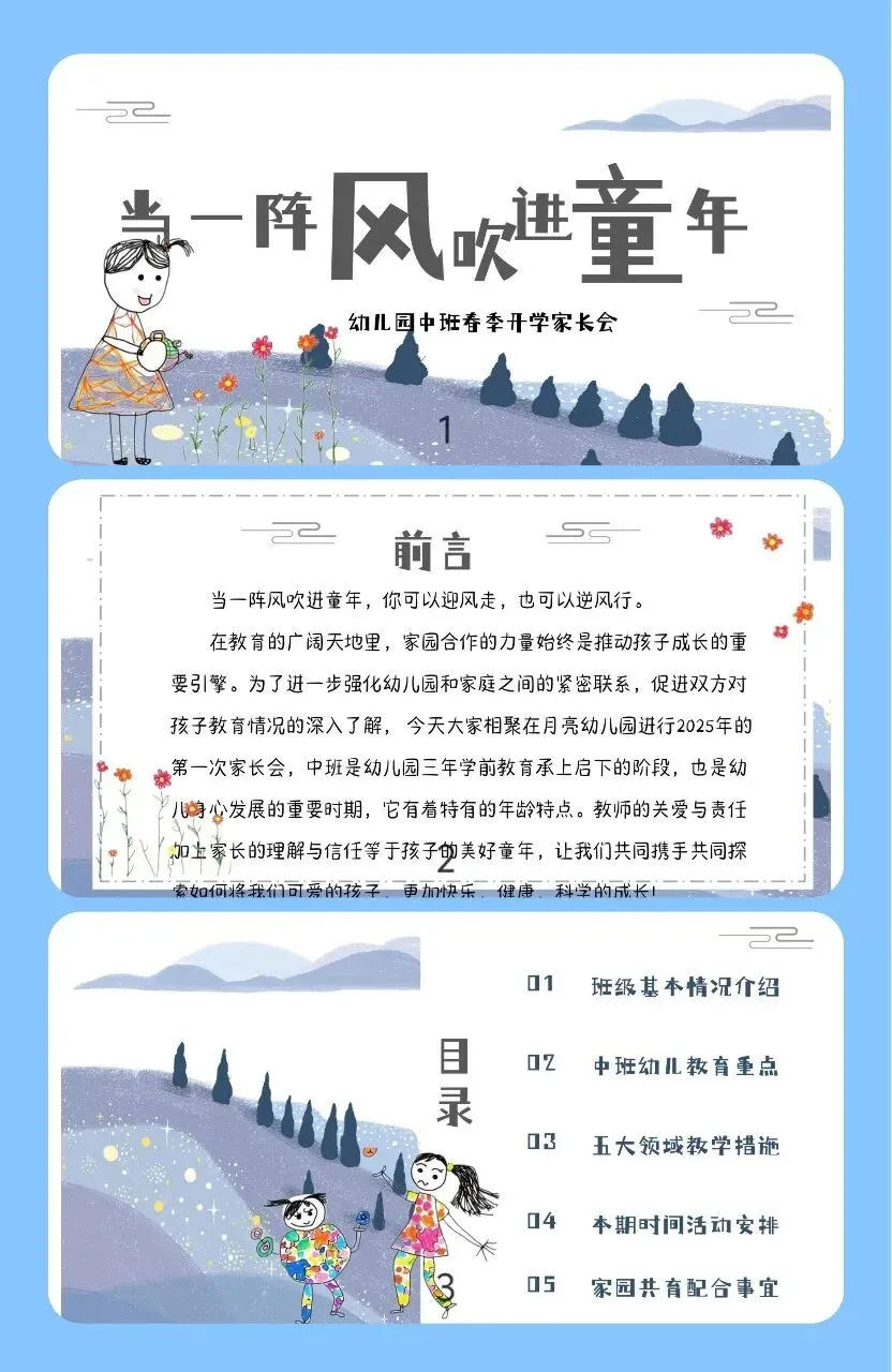 当一阵风吹进童年,你可以迎风走,也可以逆风行。在教育的广阔天地里,家园合作的力量始终是推动孩子成长的重要引擎。为了进一步强化幼儿园和家庭之间的紧密联系,促进双方对孩子教育情况的深入了解, 今天大家相聚在幼儿园进行2026年的第一次家长会,中班是幼儿园三年学前教育承上启下的阶段,也是幼儿身心发展的重要时期,它有着特有的年龄特点。教师的关爱与责任加上家长的理解与信任等于孩子的美好童年,让我们共同携手共同探索如何将我们可爱的孩子,更加快乐、健康、科学的成长!