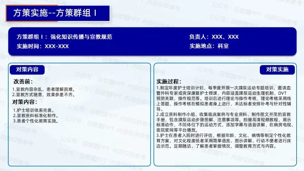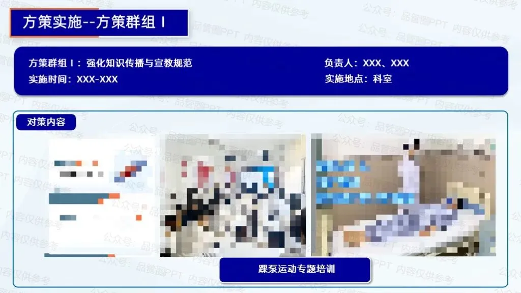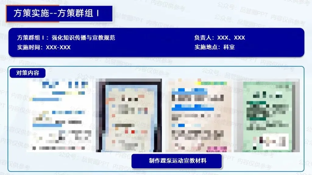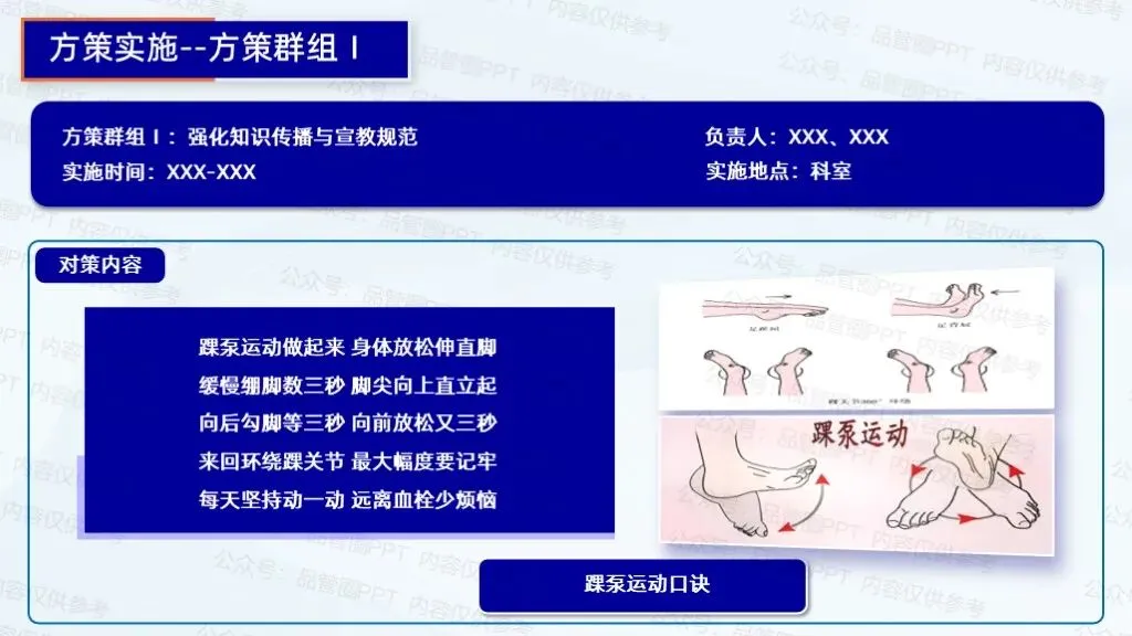 2.成立资料制作小组,收集临床案例与专业资料,制作图文并茂的宣教手册,包含踝泵运动步骤图解、注意事项等。拍摄高清视频教程,展示标准动作、不同体位下的运动方式,添加字幕与语音讲解,在病房电视、医院官网等平台播放。