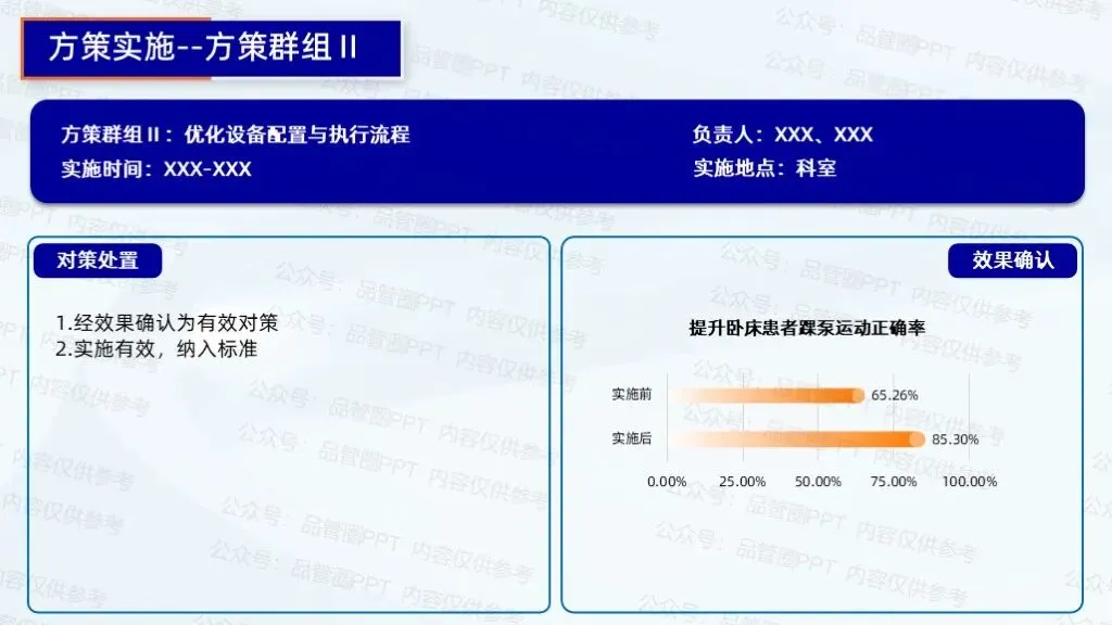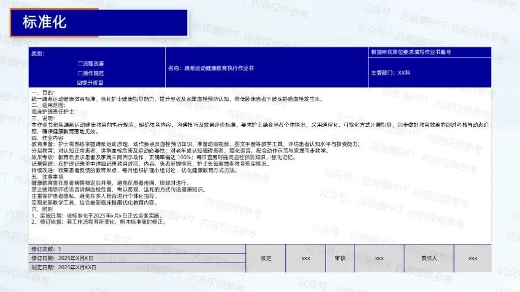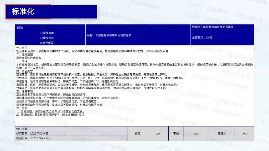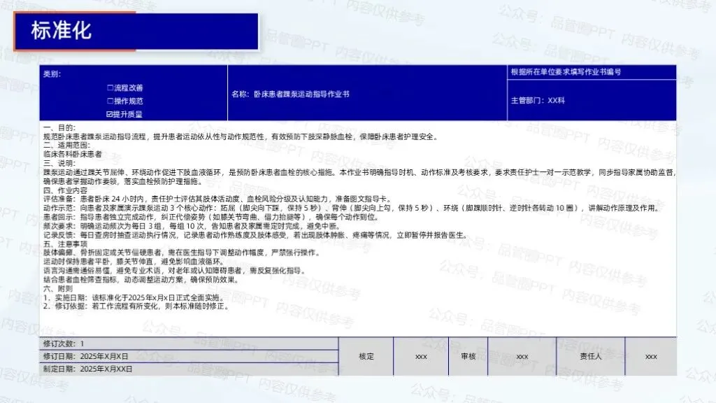 2.制定踝泵运动宣教、评估、记录流程手册,明确各环节时间节点、操作标准与责任人,组织护士培训学习。成立监督小组,每周检查流程执行情况,通过查阅病历、询问患者等方式,发现问题及时反馈整改。