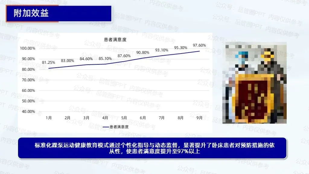 踝泵运动的标准化健康教育模式应用于卧床患者后,在提升踝泵运动依从率、降低下肢静脉血栓发生率及提高运动正确率方面均取得显著有形成果,各项指标改善后数据明显优于改善前且部分超过目标值。标准化踝泵运动健康教育模式通过个性化指导与动态监督,显著提升了卧床患者对预防措施的依从性,使患者满意度提升至97%以上。