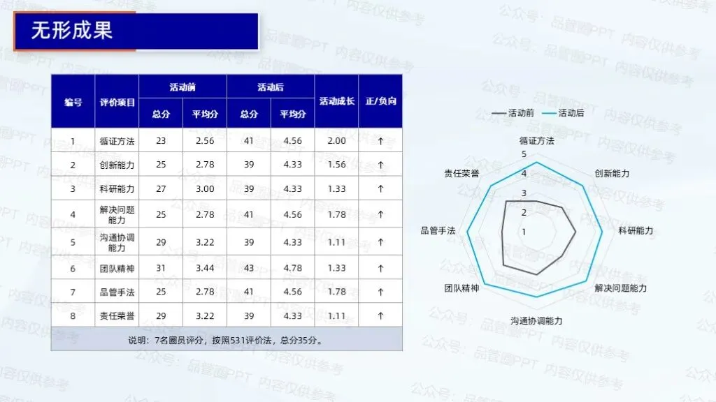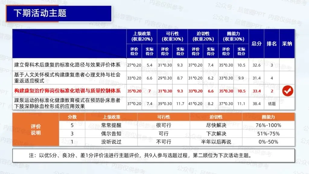 实施踝泵运动的标准化健康教育模式后,在无形成果方面,圈员们在循证方法、创新能力等多项能力上均有显著提升,活动成长值均为正向发展。通过标准化作业书,确保工作流程规范化、操作统一化,提升工作效率与服务质量。通过检讨改进,纠正偏差,激发团队创新思维,推动工作方法与流程不断优化,适应变化,持续进步,为患者提供更优质、高效护理服务。下期活动主题:构建康复治疗师岗位标准化培训与质量控制体系