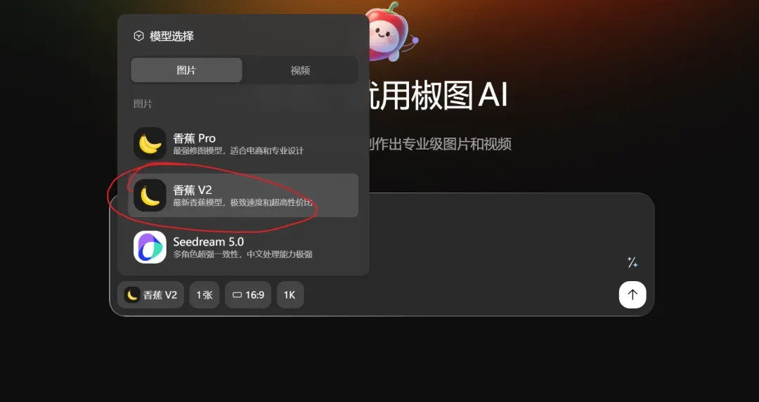 看左上角的模型选择,一定要把模型切换成【香蕉 V2】(Banana V2)!