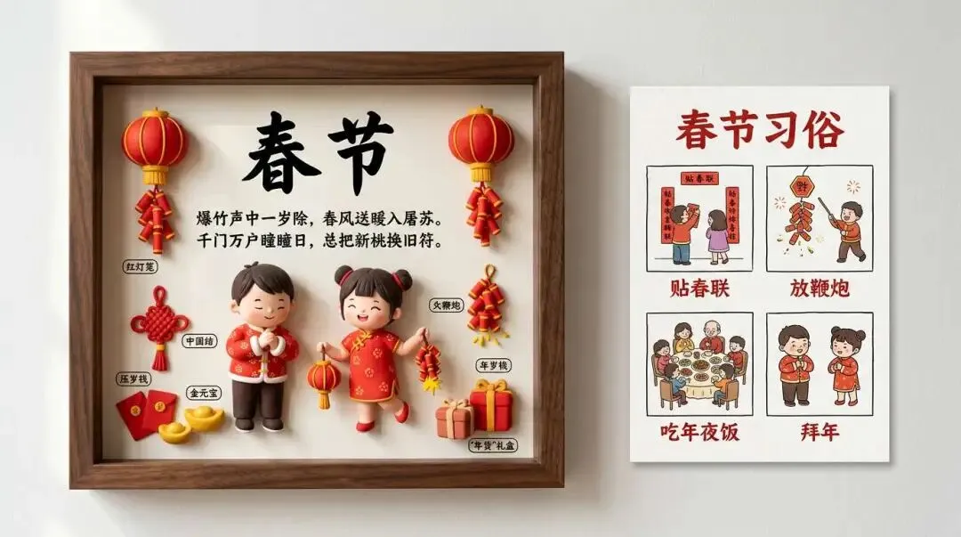 提示词(直接复制):生成一张16:9横版正面视角摄影作品,纯白墙背景,左右并排构图:左侧为深胡桃木或浅橡木色立体画框(3D),右侧为纸质习俗说明卡(2D)。左侧画框内为米白底纸,顶部黑色简体书法大字“春节”,搭配简洁中文诗句;中下部为两个Q版手工粘土人物(如男孩穿红棉袄、女孩穿旗袍),互动场景为拜年或放鞭炮,周围立体摆放红灯笼、中国结、金元宝、红包、年货礼盒等春节元素,并带白底黑边圆角中文标签(如“红灯笼”“压岁钱”“年货”),物品有真实投影和立体阴影。右侧为带纸张纹理的平面卡片,顶部标题“春节习俗”,下方2x2网格彩色简笔插画:贴春联、放鞭炮、吃年夜饭、拜年,每个下方标注对应简体中文名称。整体自然光从左侧照射,左立体右平面,主色调为红色与金色,留白充足,文字仅简体中文,真实摄影质感,4K清晰度。