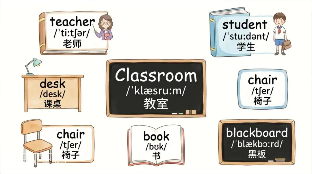 提示词(直接复制): **主题:班级(Classroom)** 16:9横版,治愈系手绘水彩风,高亮清新色调,大面积留白,浅色简洁背景,不复杂不抢文字。 画面中央突出: Classroom /ˈklæsruːm/ 教室 (可用黑板造型做标题框) 周围围绕排布以下单词,放在与班级相关的可爱元素里(如书本、课桌、书包、粉笔等造型文本框),搭配小图标: teacher /ˈtiːtʃər/ 老师 student /ˈstuːdənt/ 学生 desk /desk/ 课桌 chair /tʃer/ 椅子 book /bʊk/ 书 blackboard /ˈblækbɔːrd/ 黑板 避免:复杂背景、深色、照片风、强阴影、霓虹色、水印。 --ar 16:9