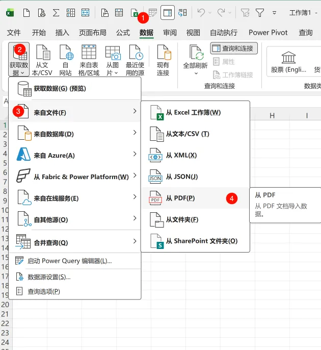 获取数据:打开Excel,点击顶部菜单栏的 数据> 获取数据> 来自文件> 来自 PDF。