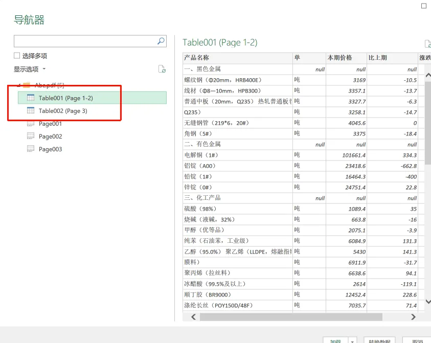 智能筛选:此时弹出的“导航器”窗口中,Excel会自动将PDF里的内容分类为“Page(页面文字)”和“Table(表格)”。因为我们第1、2页其实是一个表格,因此,这里第一个Table001(page 1-2)就表示第1、2页被识别成了一个table。第3页的表格被识别成了Table002(page 3)。