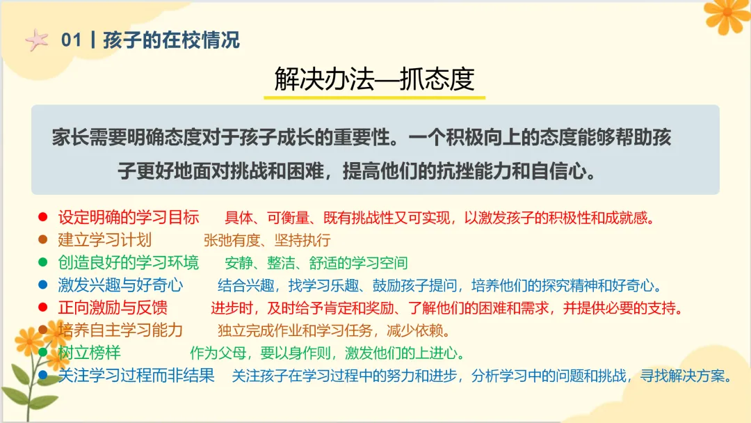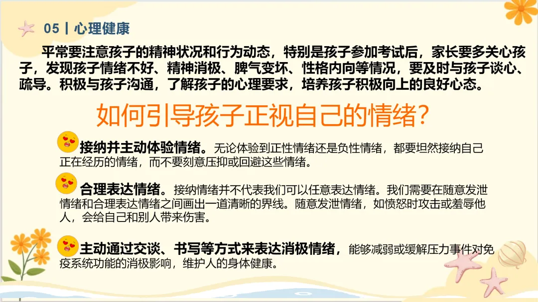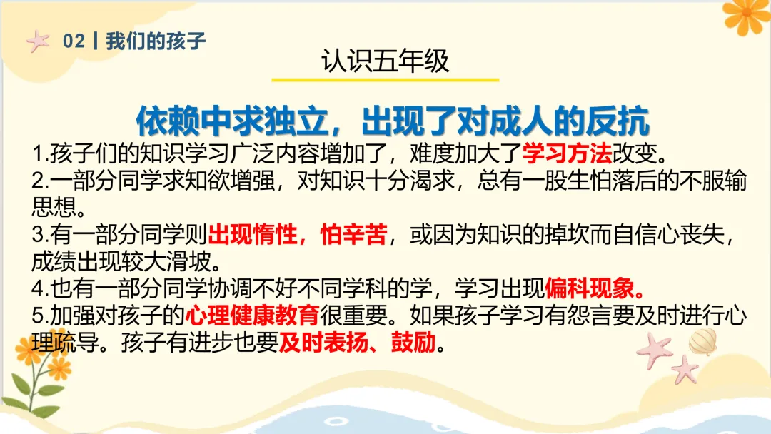 5.加强对孩子的心理健康教育很重要。如果孩子学习有怨言要及时进行心理疏导。孩子有进步也要及时表扬、鼓励。