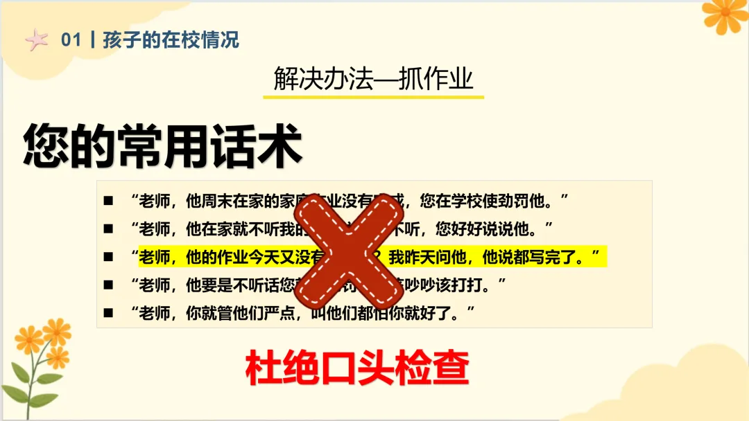 您的常用话术:“老师,他周末在家的家庭作业没有完成,您在学校使劲罚他。”