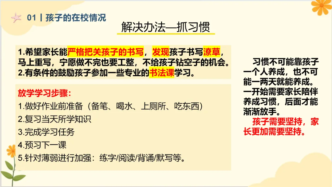 1、和老师一起帮助孩子,而不是每天盯着,可以从书写格式的调整(占格),每个星期抓一个笔画。