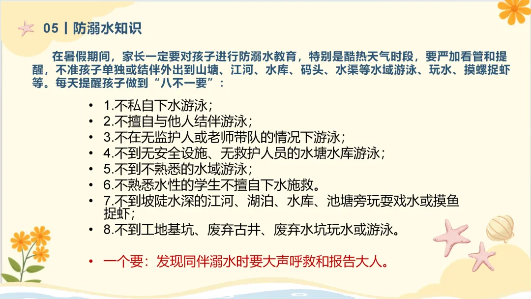 在暑假期间,家长一定要对孩子进行防溺水教育,特别是酷热天气时段,要严加看管和提醒,不准孩子单独或结伴外出到山塘、江河、水库、码头、水渠等水域游泳、玩水、摸螺捉虾等。每天提醒孩子做到“八不一要”: