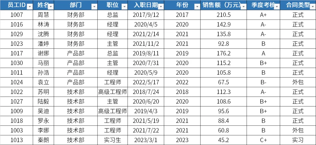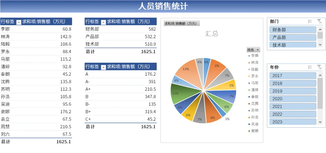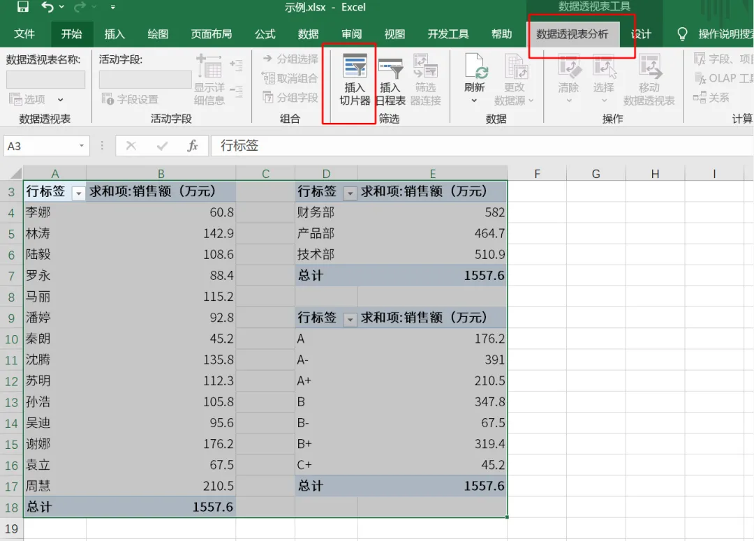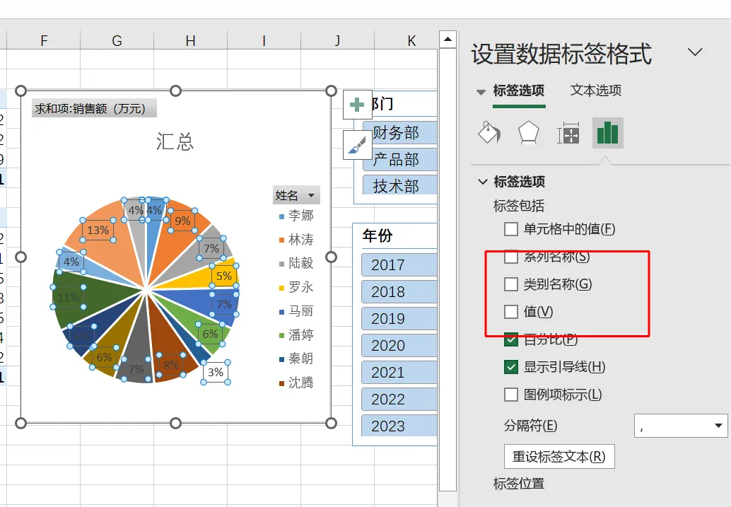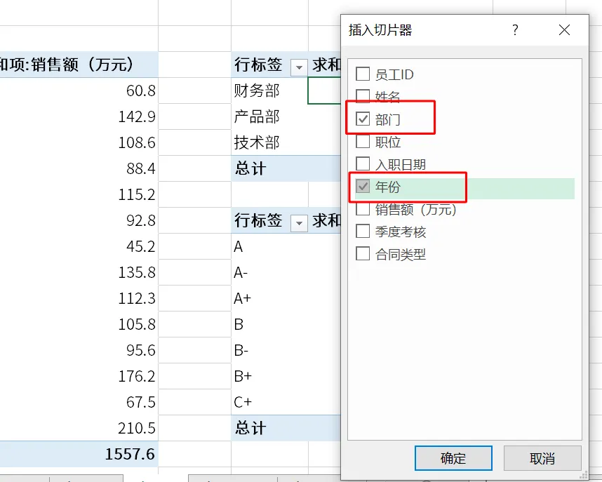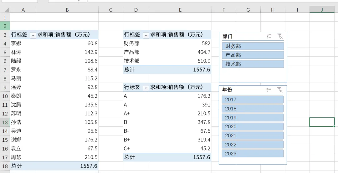 得到下面的两个切片器,点击财务部,左侧数据透视表出现的都是财务部数据,相当于筛选的作用