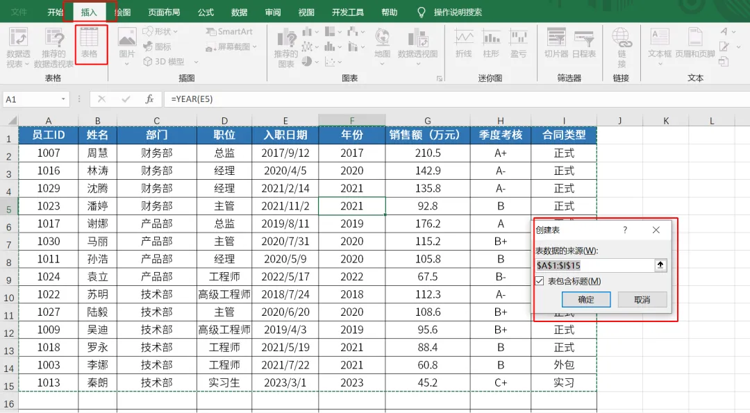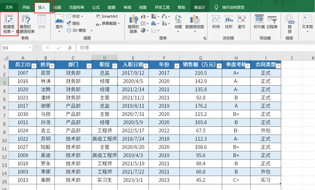 选中任意单元格,插入-表格,先将数据变成超级表,这样如果后续再增加一个人的数据,刷新透视表后,数据透视表数据也会跟着数据源更新