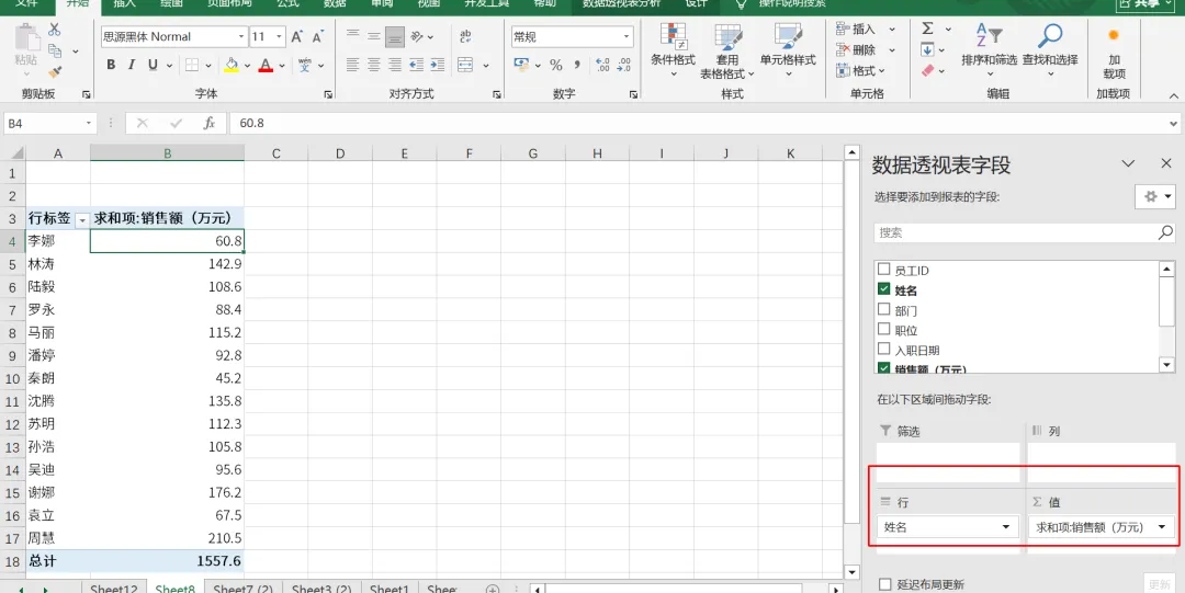 我这里行放的是姓名,值是销售额,这块根据需要拖入相应字段