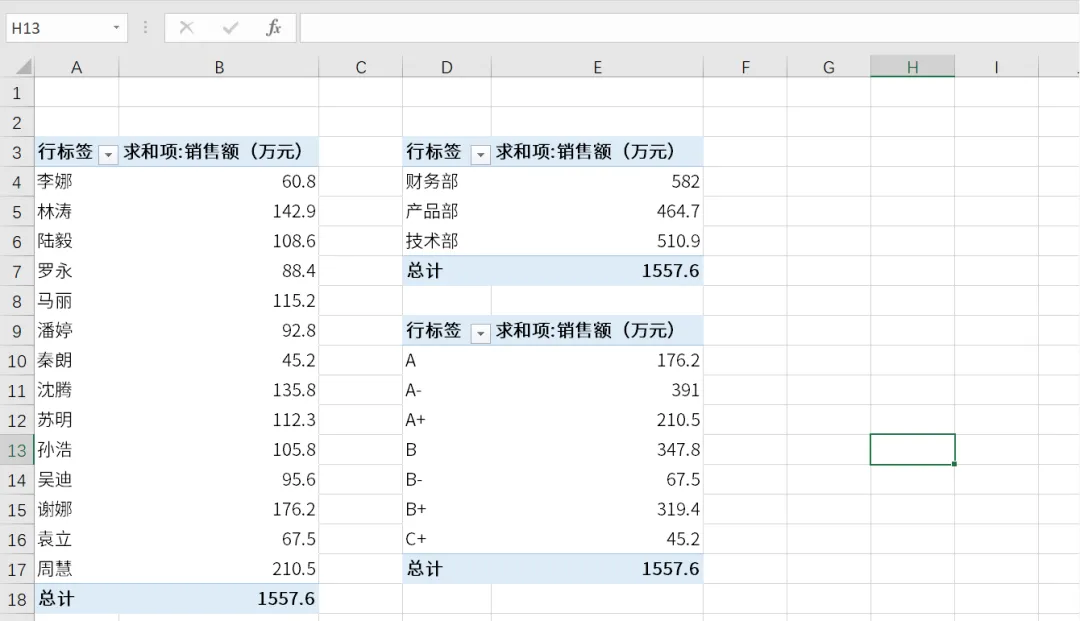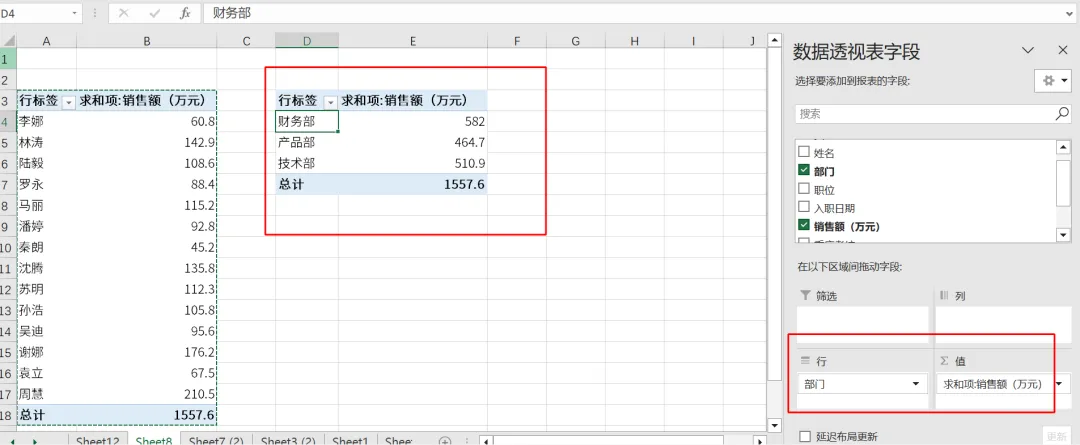 之后我们将做好的数据透视表,复制一个,将行变成部门,值仍然是销售额