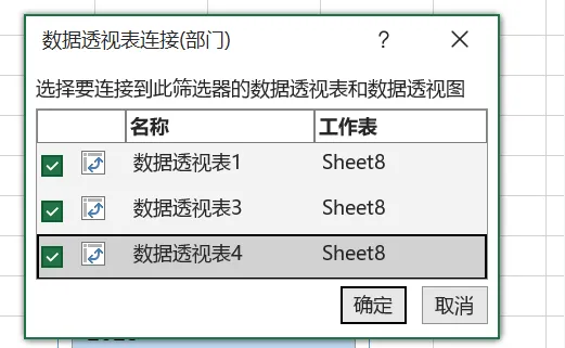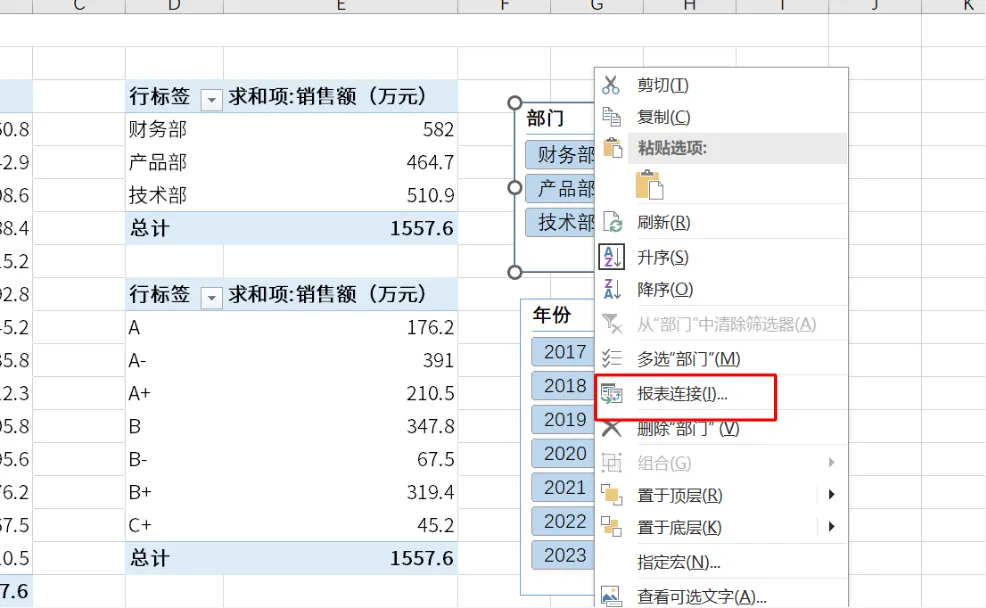 这里我们需要进行以下操作,来联动所有透视表,选中部门切片器,右键报表连接