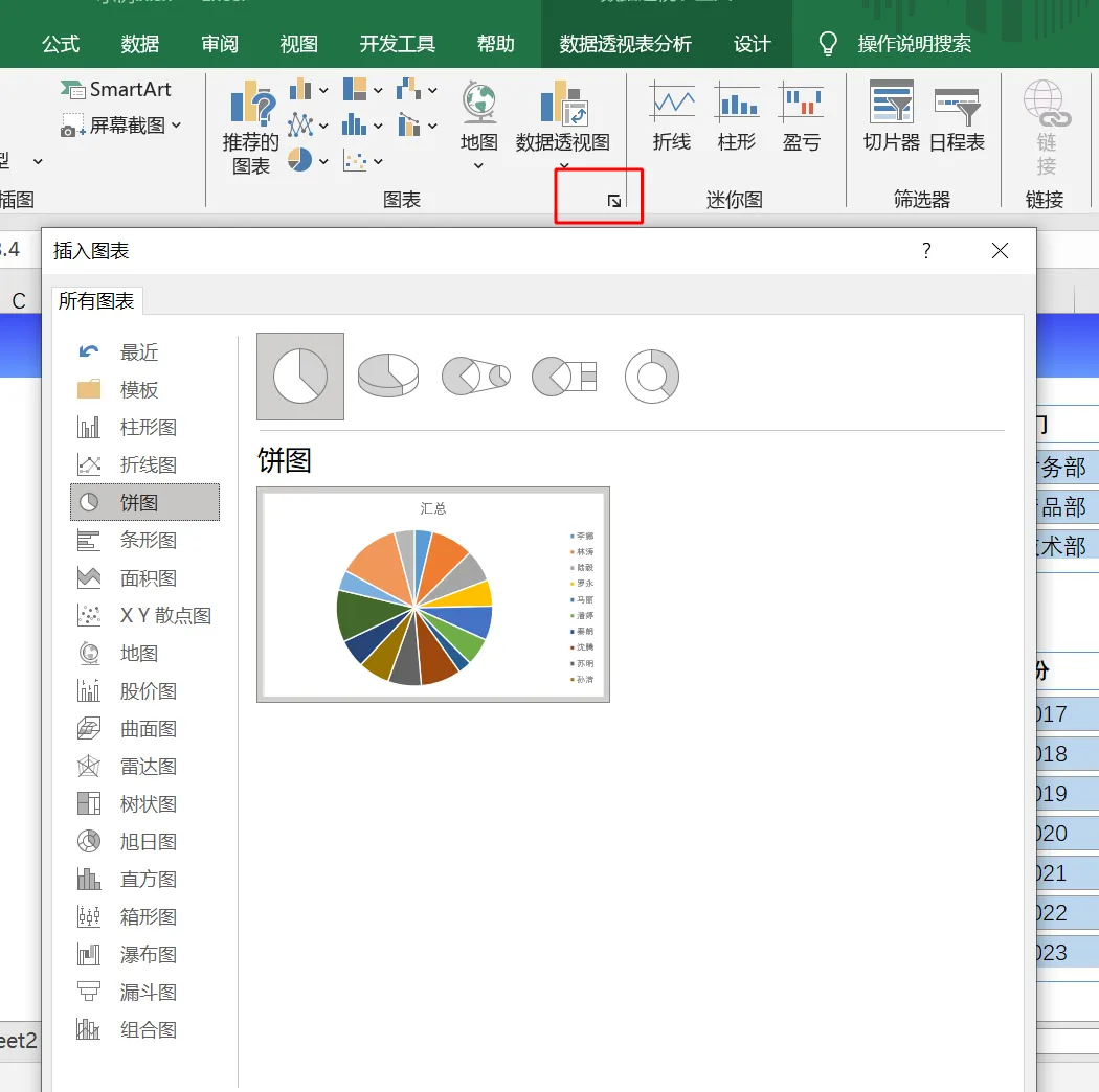 仪表盘怎么能没有图表,我们再来俩图表,单击第一个透视表,插入-饼图