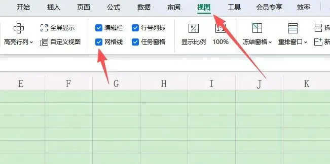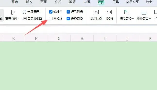 操作: 在“显示”功能组中,取消勾选 【网格线】 复选框,即可隐藏默认的灰色网格线。