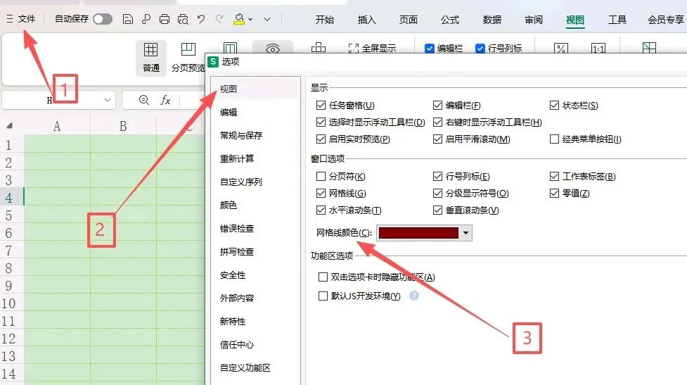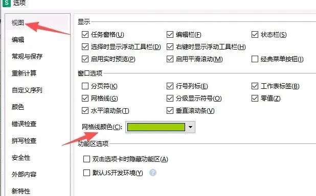 找到下方的 【网格线颜色】 选项,点击右侧的下拉箭头,从调色板中选择您需要的颜色。