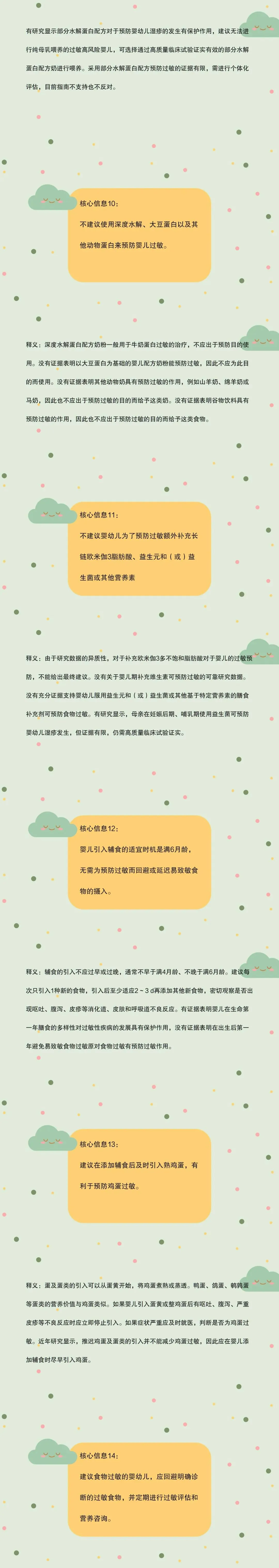 11.不建议婴幼儿为了预防过敏额外补充长链欧米伽3脂肪酸、益生元和(或)益生菌或其他营养素。