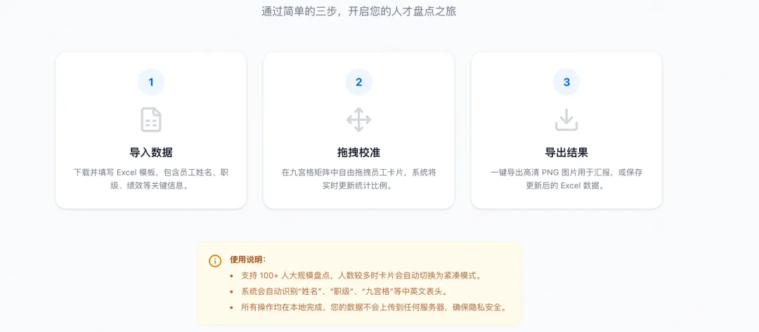 最近好几个大厂都在考核/盘点,对于关键人才的盘点,我们使用最多的就是九宫格。但是九宫格虽然直观,但对 HR 的操作就很不友好,很多 HR 的伙伴依赖 excel 表格或者 PPT 来和业务管理者对齐,不仅之前要准备,之后还要再回写到 excel 或者系统。 因此我就做了一个九宫格的拖拉神器,放在了 google 的 AI studio,可以访问的伙伴可以直接使用或者下载在本机使用:https://ai.studio/apps/220cbfd7-147d-47b7-bb64-f9b26310b889?fullscreenApplet=true主要的功能和界面如下,通过三步就可以直接使用,完成九宫格的对齐和操作最多支持100位,会自动的重新布局,可直接拖拉,上方会自动的统计,可以直接导出 excel 或者图片可以的,直接下载项目在本地生成“单文件版” (推荐)- 可以的,下载项目后用任何 AI codding 工具【code buddy/ Codex/Claude 等】打开,然后直接自然语言对话修改就好