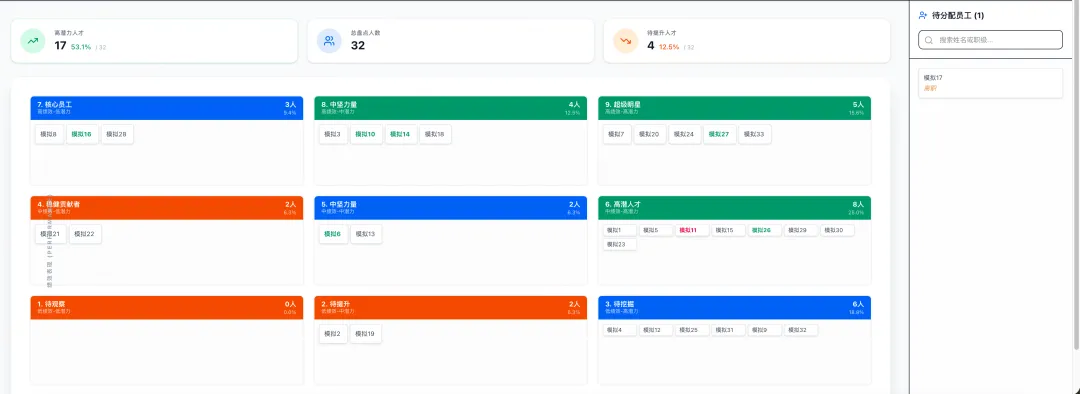 - 左侧 (Flex-1): 3x3 矩阵容器。每个格子需显示标题、统计百分比及员工卡片列表。