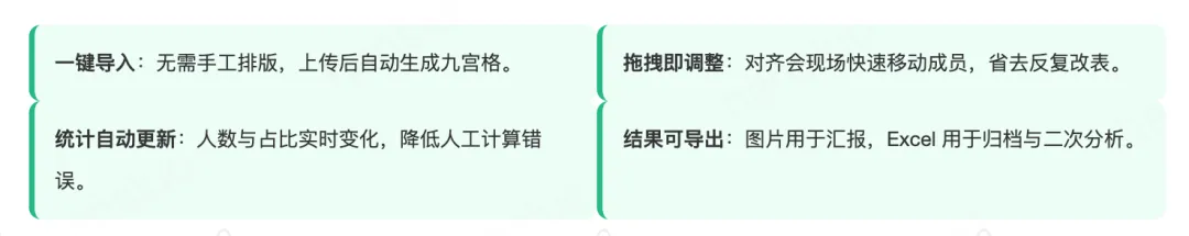 xlsx 解析 Excel。支持字段容错映射(如“姓名/Name”、“职级/Grade”)。 - 九宫格布局: