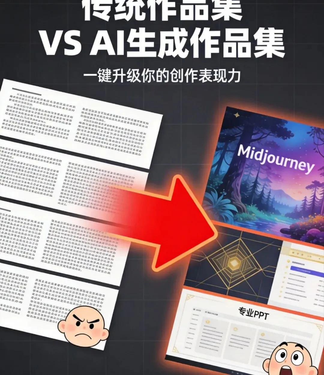 2026年,中国AI调用量首次超过美国,成为全球第一。AI岗位暴增14倍,但87%要求项目经验。你的作品集还在用“Word+截图”?今天我给你一套降维打击组合:Midjourney生成素材,PPT快速组装,10分钟产出让HR惊艳的作品集。这不是炫技,是2026年求职的生死线。
