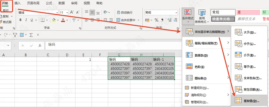 - 选中数据源内容 → 开始 → 条件格式 → 突出显示单元格规则→ 重复值 / 唯一值 → 不同内容自动标色,一眼看出差异;