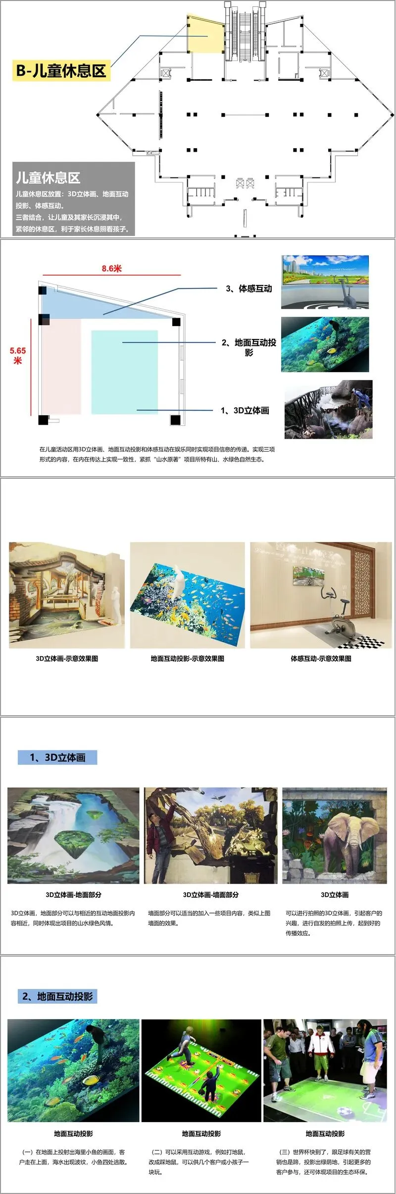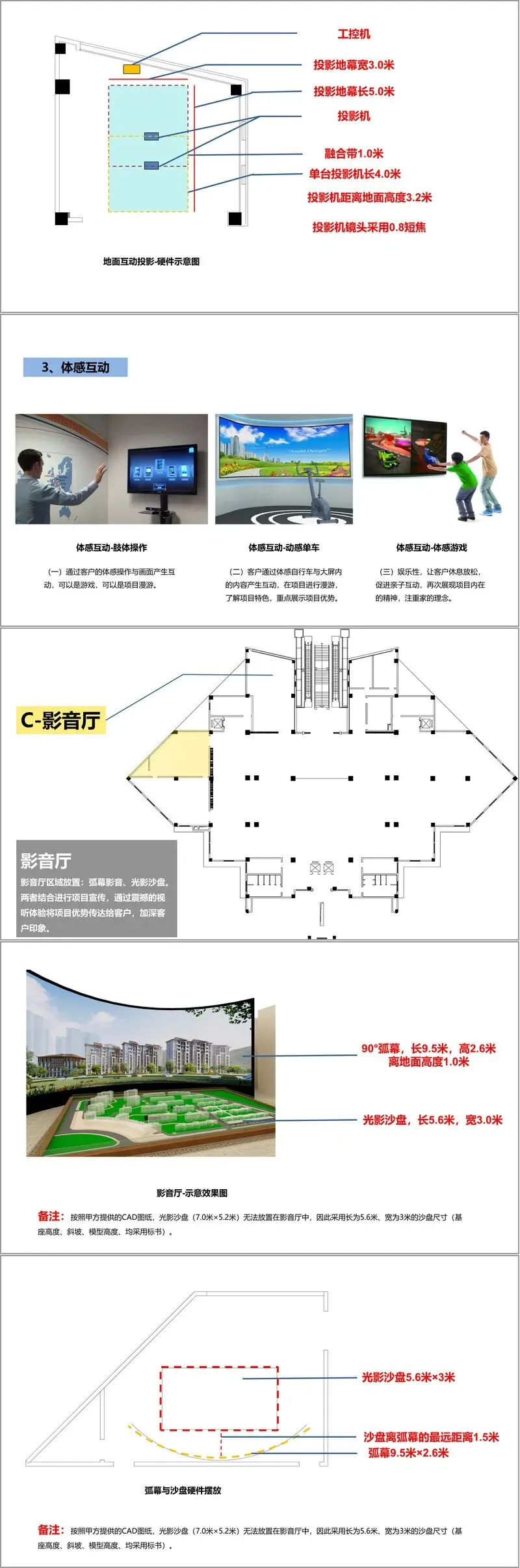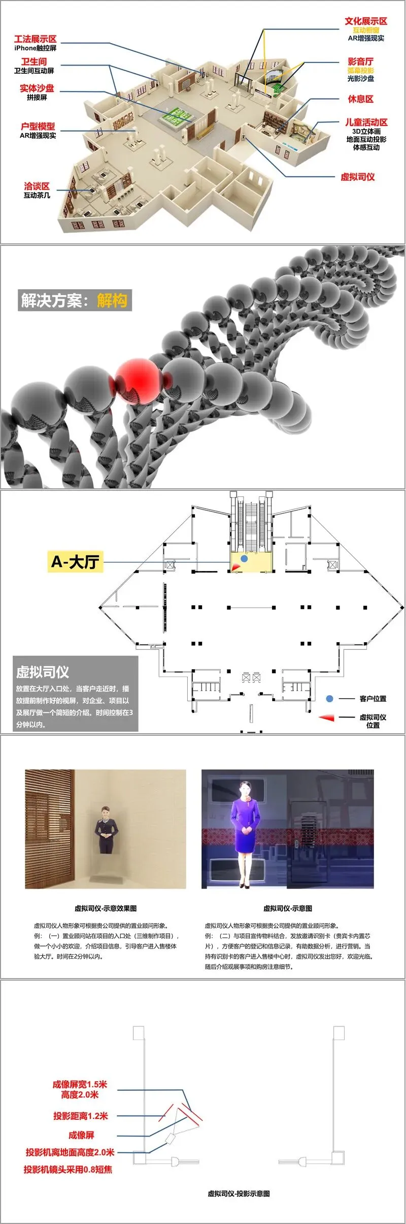 硬件布置与技术应用是方案的核心亮点,各区域针对性配置数字化设备,形成连贯的体验动线。大厅入口设置虚拟司仪,通过 3 分钟内的短视频介绍企业与项目,支持贵宾卡识别与个性化问候;儿童活动区整合 3D 立体画、地面互动投影、体感互动,传递项目山水生态特色,同时方便家长照看;影音厅采用 90° 弧幕与光影沙盘联动,通过大气恢弘的三维动画与实拍影片,分篇章展现城市辉煌、项目价值与企业敬意,加深客户印象;文化展示区运用互动橱窗与 AR 增强现实,以树藤开花演化企业荣誉、商队意象再现城市底蕴等创意形式,强化品牌信任;沙盘区通过 3×3 拼接屏与实体沙盘互动,具象化展示项目区位与景观优势;工法展示区采用立式iPhone 触控屏,结合实物展示建设材料与工艺,增强客户安全感;户型沙盘区借助 iPad 扫描实现 AR 增强现实,支持户型 360° 鸟瞰与全景展示;洽谈区配置互动茶几与 iPad 销售系统,方便一对一交流、房源查询与表单填写;卫生间也嵌入互动屏,让客户在细节中感受科技实力,延续项目认知。