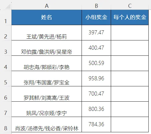 在日常财务或团队管理中,常会遇到这样的场景:多个成员同属一个小组,奖金总额记录在同一单元格中,需快速计算每人应得金额。