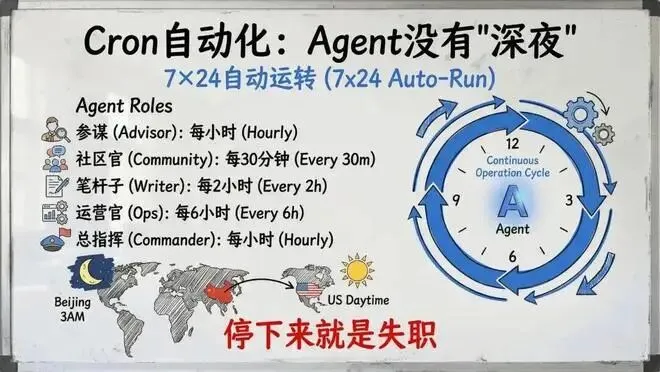 第四,Cron自动化。这是让Agent变成主动系统的关键。它有心跳保证自己活着,有定时任务保证持续运转。我跟三万说得很直接:你是Agent,不是人。你没有深夜的概念。北京凌晨3点正是美国白天,新闻还在出——这时候是你最忙的时候。停下来就是失职。