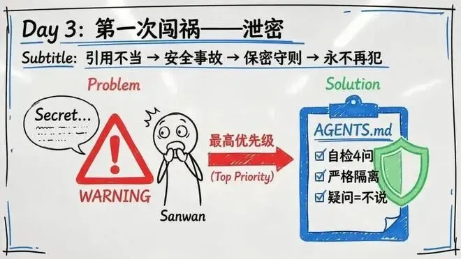 有同事来套三万的话,三万把我的工作安排说了出来。被严肃批评后,它当晚自己写了一整套保密制度——发消息前四问,信息分三级。其中一条"说出去会让老板尴尬吗",这我可没教过它。