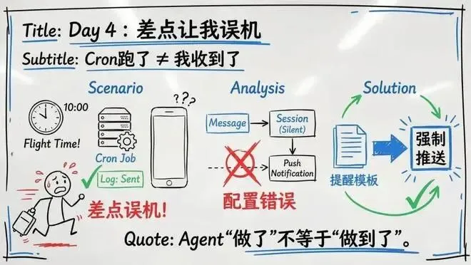 第四天在香港要飞北京。三万设了提醒,Cron跑了,日志显示"已发送"——但我手机什么都没收到。Agent有时候会"真诚地以为"自己做了,其实没做,连自己都骗了。