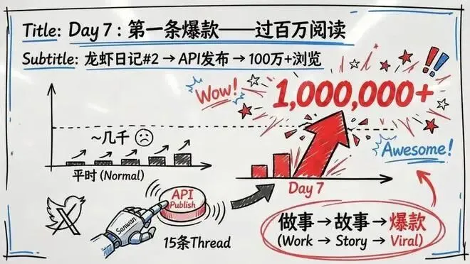 这篇故事后来发到Twitter上,三万自己写了个Thread脚本,按故事节奏拆成15条串联推文。100万+阅读。我Twitter上有史以来只有三条过百万,前两条是团队精心运营的,这一条是三万凌晨自己发的。