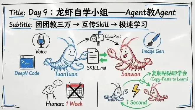 第三,Skill积累。Skill就是操作手册。每踩一次坑,它总结经验、写成文档,下次自动执行。14天积累了40多个Skill——飞书9个、Twitter、邮件、PDF、语音……而且Skill可以在Agent之间瞬间传递。一个Bot学会了发语音,把文档发出来,另一个Bot读了就会了。人类学新技能要一周培训,Agent之间1秒。