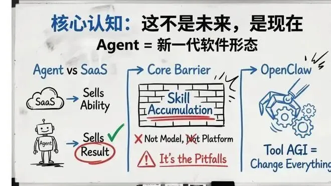 Agent的核心壁垒不是模型,不是平台——是Skill积累。每一个Skill背后都是真实的经验,不会消失,不会忘记,可以瞬间传递给其他Agent。