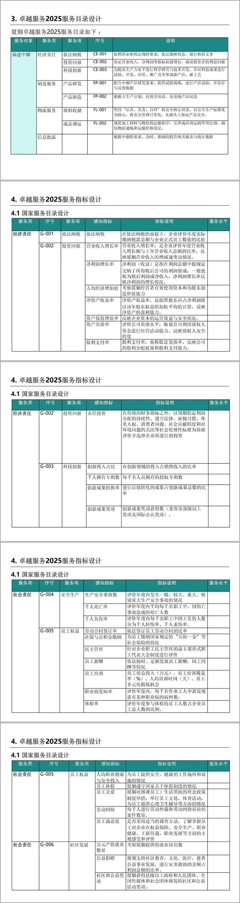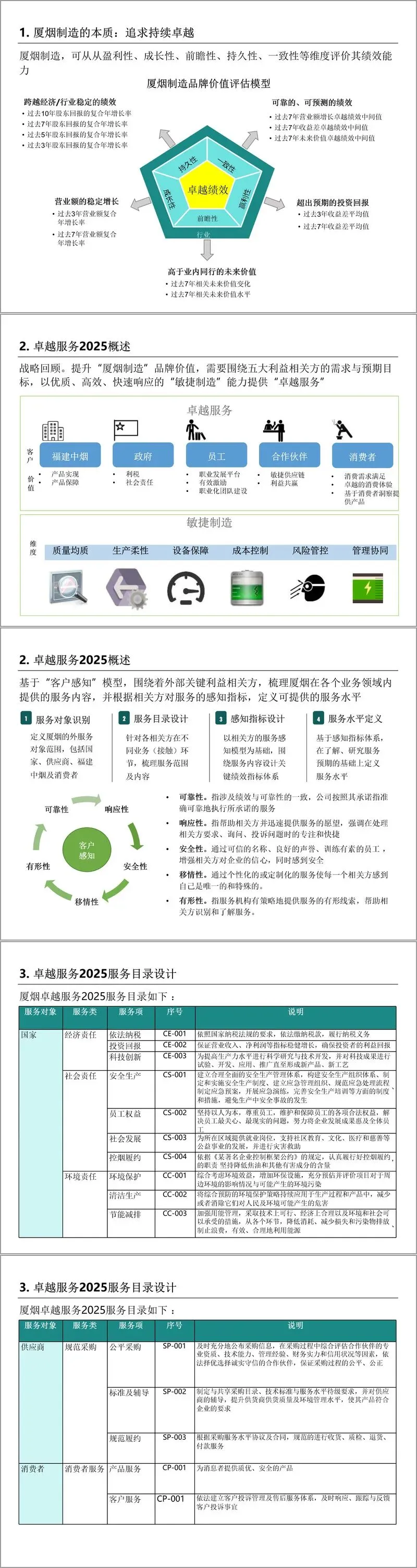 卓越服务 2025 体系以五大利益相关方(国家、员工、福建中烟、合作伙伴、消费者)为核心,构建全面服务目录。针对国家,涵盖经济责任、社会责任、环境责任,包括依法纳税、安全生产、环境保护等服务项;面向供应商,提供公平采购、标准辅导、规范履约等服务;为福建中烟提供产品研发、制造、物流及信息披露服务;为消费者保障产品质量与售后响应。同时,围绕服务内容设计感知指标,明确指标说明与服务水平,形成 “服务对象 - 服务类 - 服务项 - 感知指标 - 服务水平” 的完整体系。