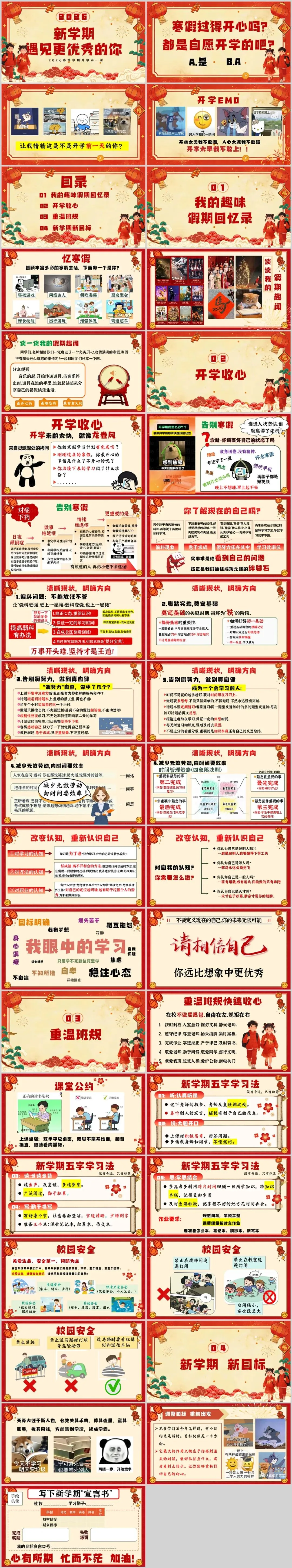 课件以喜庆温暖的红色为主色调,搭配生动可爱的插画,版面活泼富有朝气,能第一时间抓住学生的注意力,营造积极向上的新学期氛围。